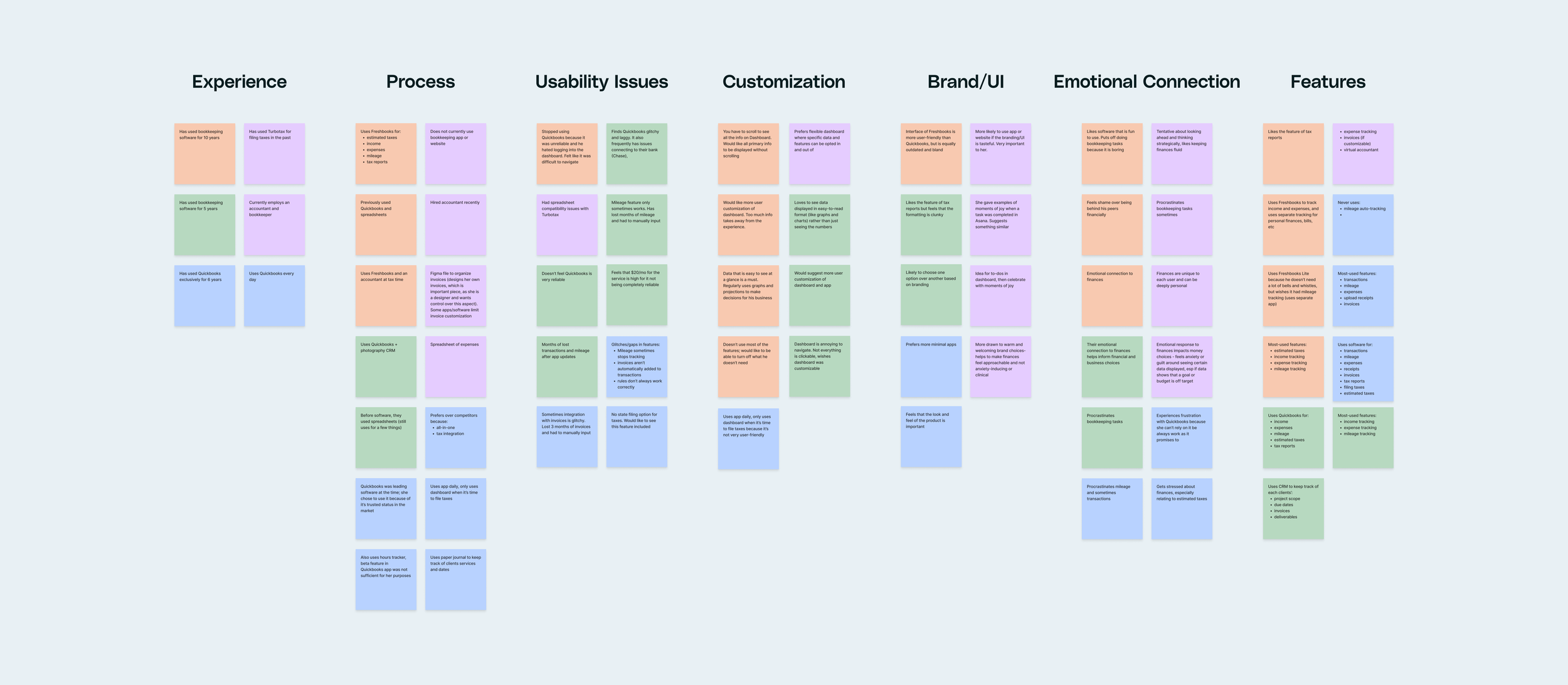 Four small business owners and freelancers were interviewed to understand their bookkeeping processes and level of satisfaction with their current products. Using affinity mapping, I categorized their responses into seven key areas: Experience, Process, Usability Issues, Customization, Brand/UI, Emotional Connection, and Features.