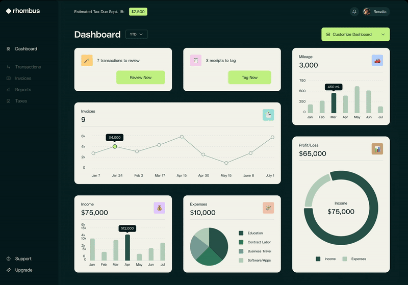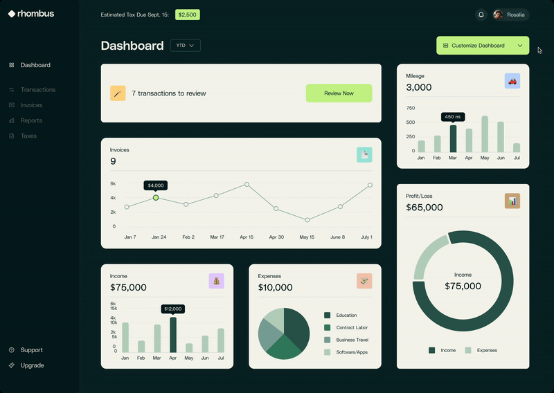 Users want a bookkeeping experience that is customizable, fun, and easy to navigate. Rhombus meets this need with a vibrant, user-friendly dashboard that can be tailored to fit each person’s unique needs, making bookkeeping more efficient and enjoyable.