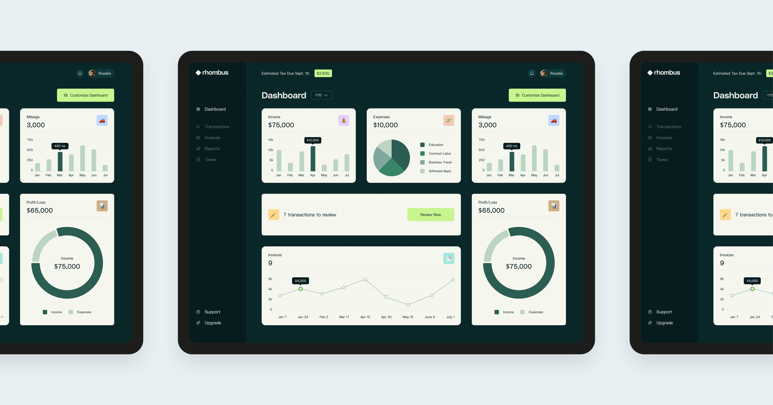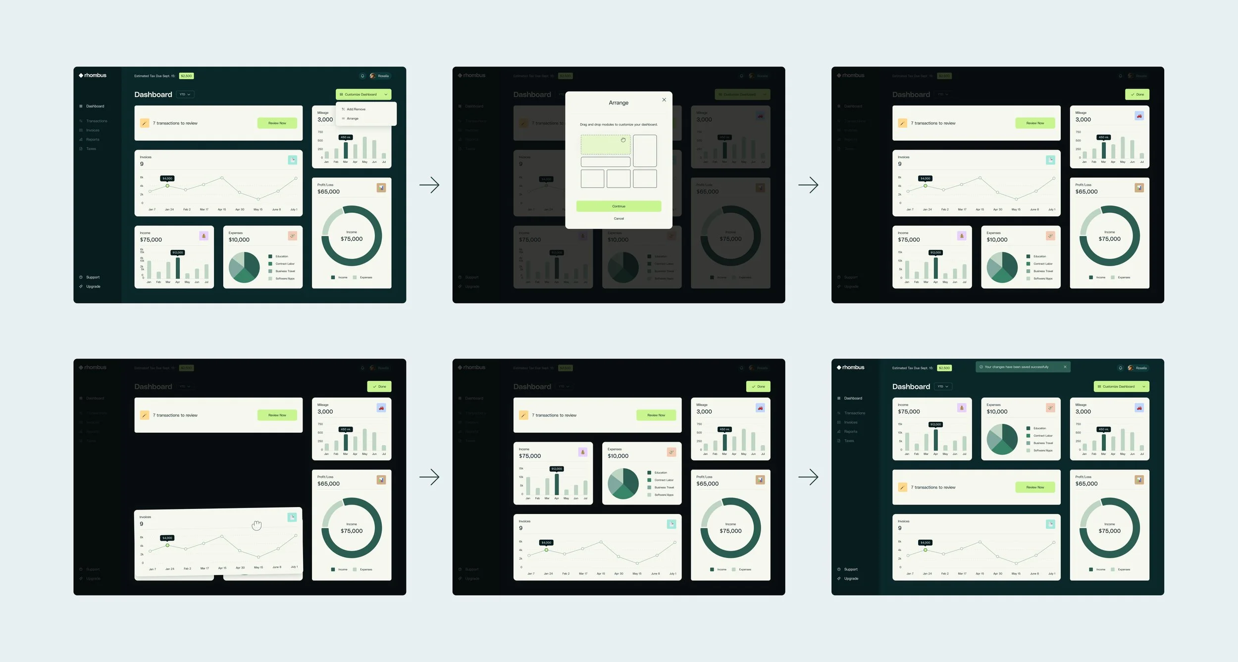 Rhombus addressed these user needs with a vibrant, user-friendly dashboard that can be tailored to each person’s unique preferences, making bookkeeping more efficient and enjoyable. The key solutions are outlined below.