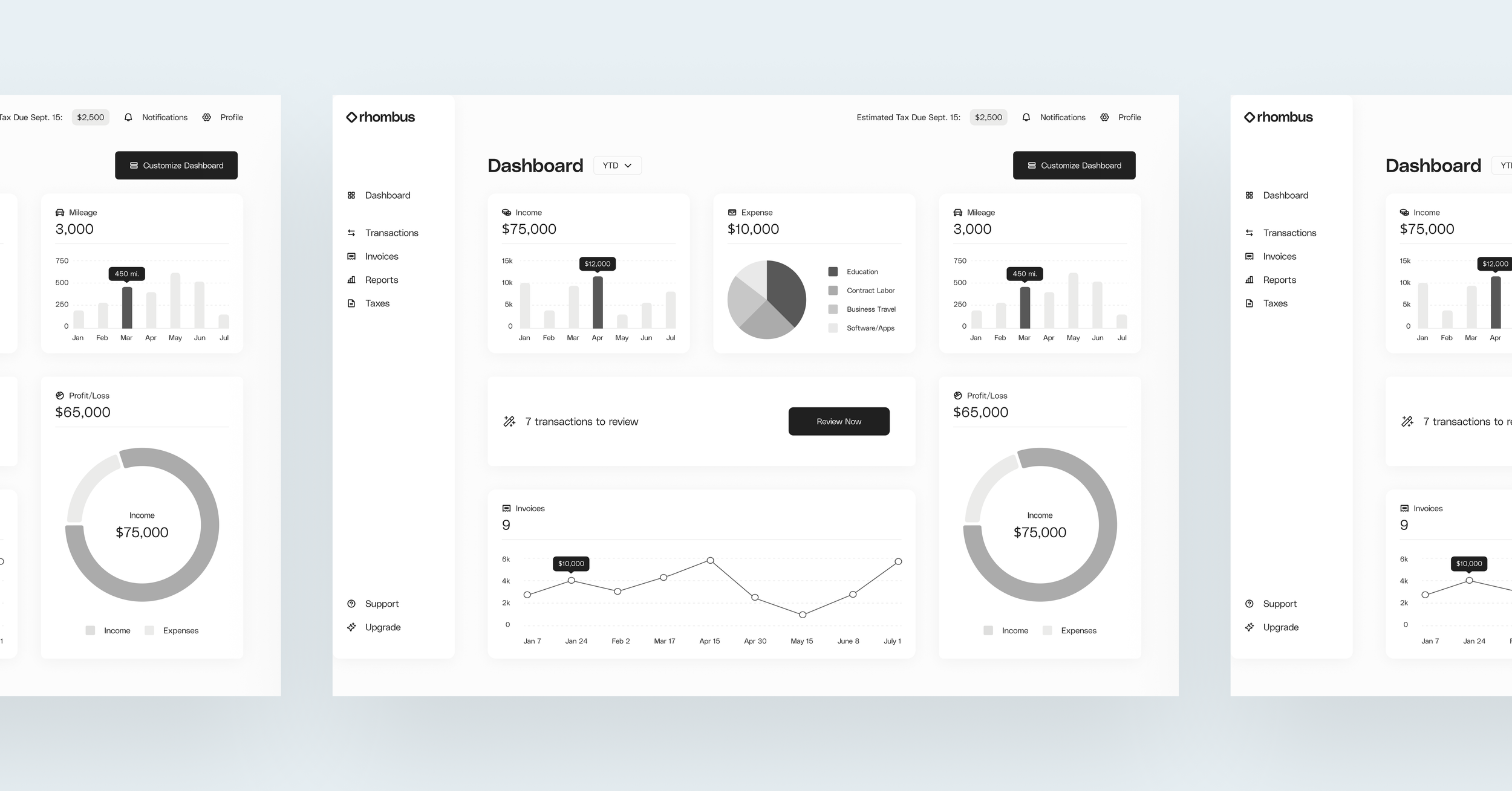 When planning the initial desktop dashboard designs, it was important to consider responsiveness. User feedback indicated that while most users wanted to complete basic bookkeeping tasks on mobile, they preferred to reserve more complex or graph-heavy tasks for desktop, so I focused a great deal of attention on the desktop version in the early stages.