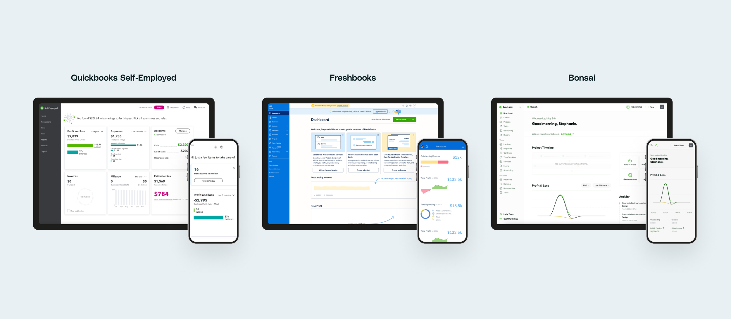 QuickBooks stands out for its comprehensive features and trusted platform but suffers from poor responsive design and stability issues. FreshBooks is robust and user-friendly, yet cluttered and lacks customization and mileage tracking. Bonsai excels in ease of use and aesthetic appeal but also misses out on customization and mileage tracking features. Each product has its strengths and weaknesses, highlighting different areas for potential improvement and user satisfaction.